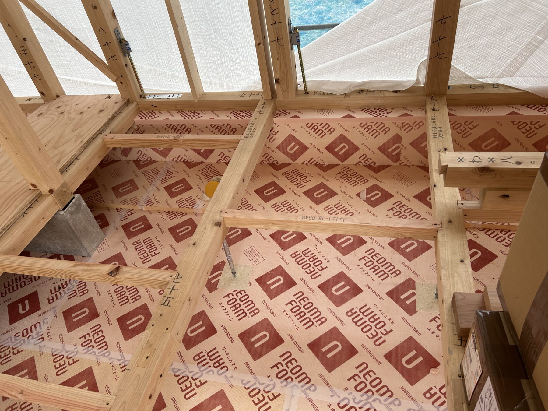まず床下に断熱材を敷いていき、大引と根太を据えていきます。
