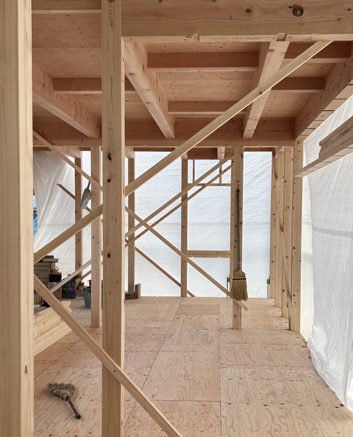 内部は躯体検査に向けて耐力壁を貼るなど、工事を進めていきます。