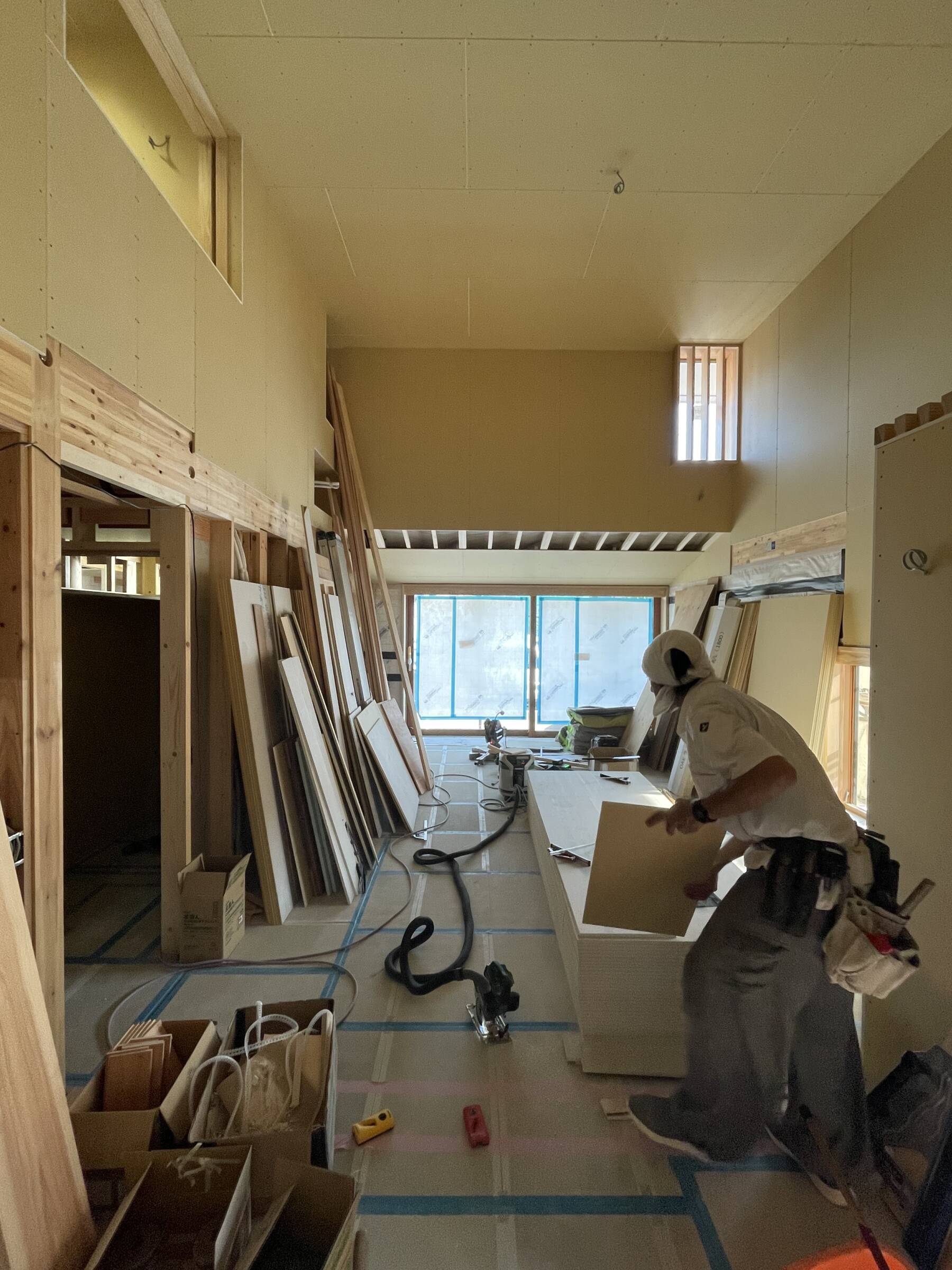 壁面・天井面のプラスターボード貼を進めています。