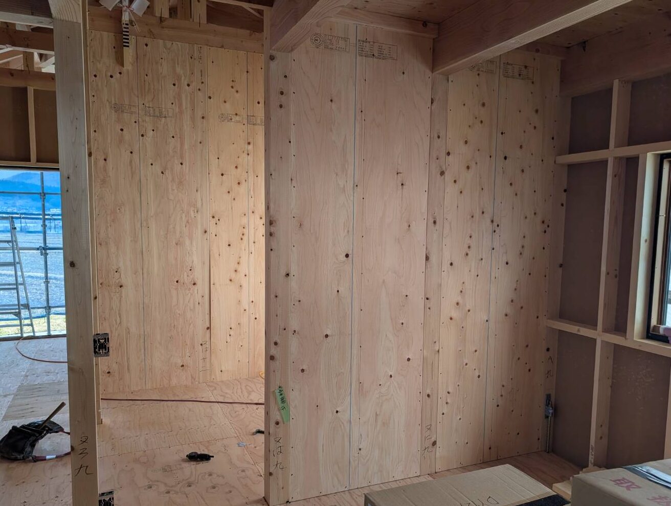 内部は躯体検査に向けて耐力壁を貼るなど、工事を進めていきます。