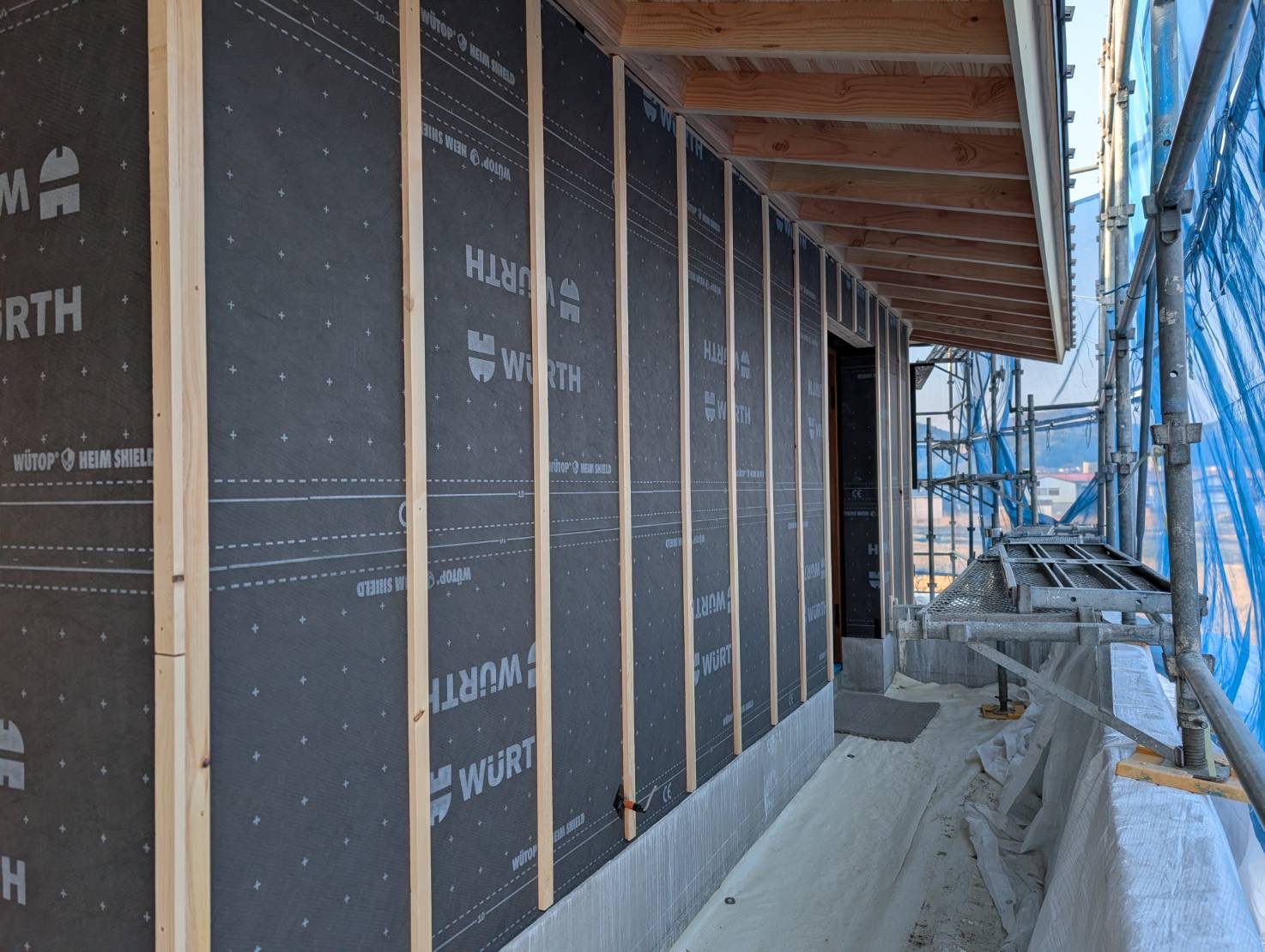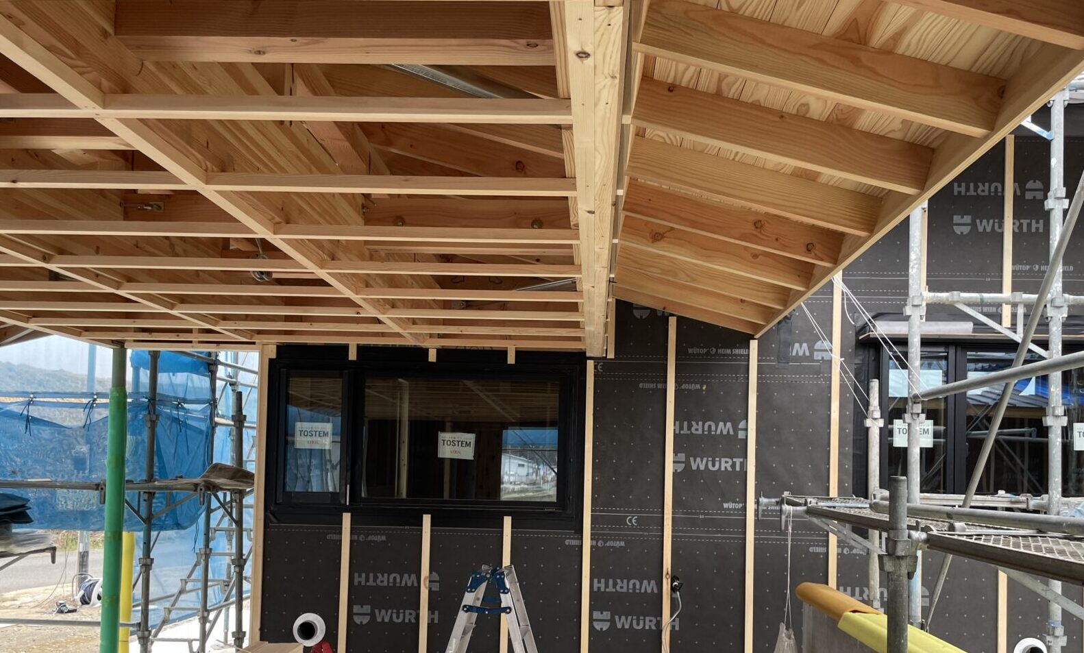 今後は大屋根の軒天材を貼り進め、外壁材を貼っていく予定です。