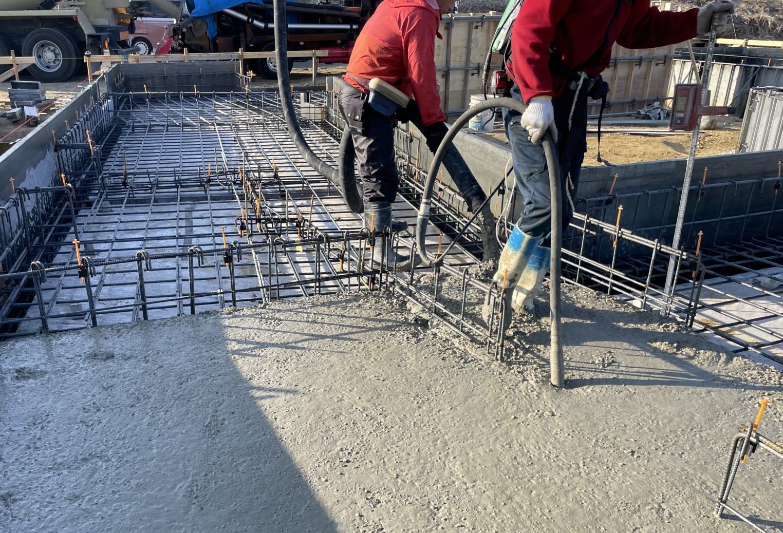 打設の際はコンクリート用のバイブレーターを使い、コンクリート内の空隙をなくし隅々までコンクリートが充填されるようにしていきます。