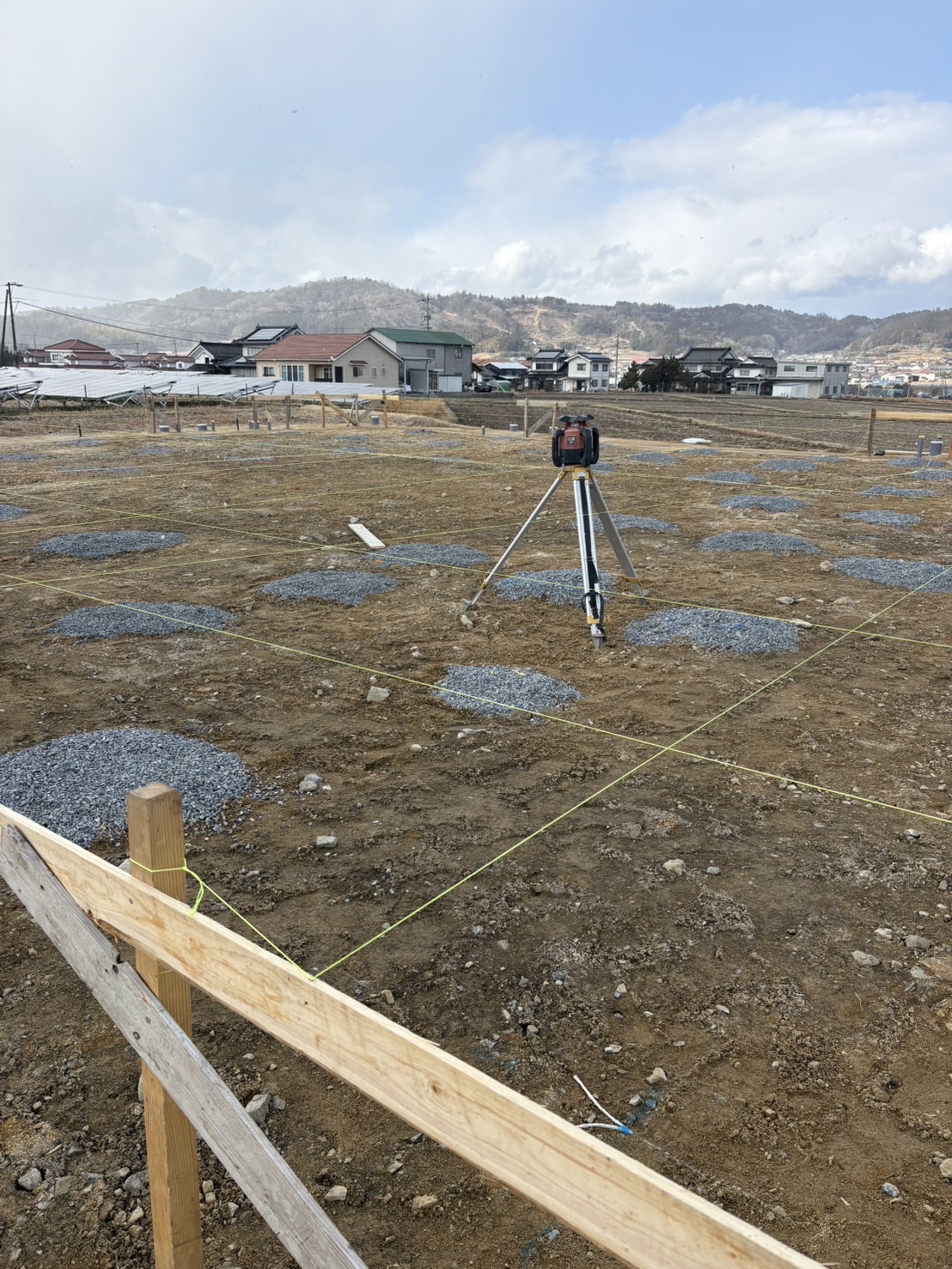 基礎工事は、まず建物の配置や基礎の高さなどを仮設する遣り方工事を行います。