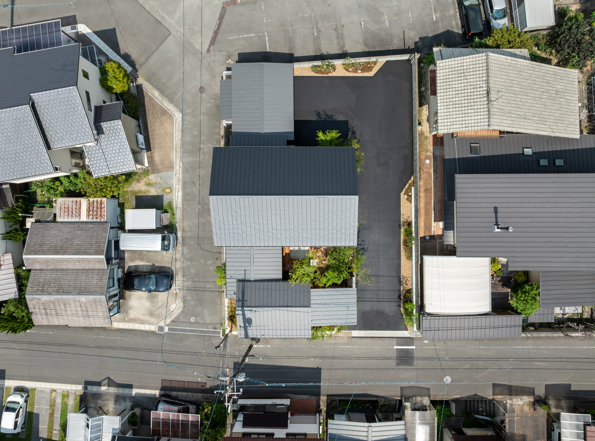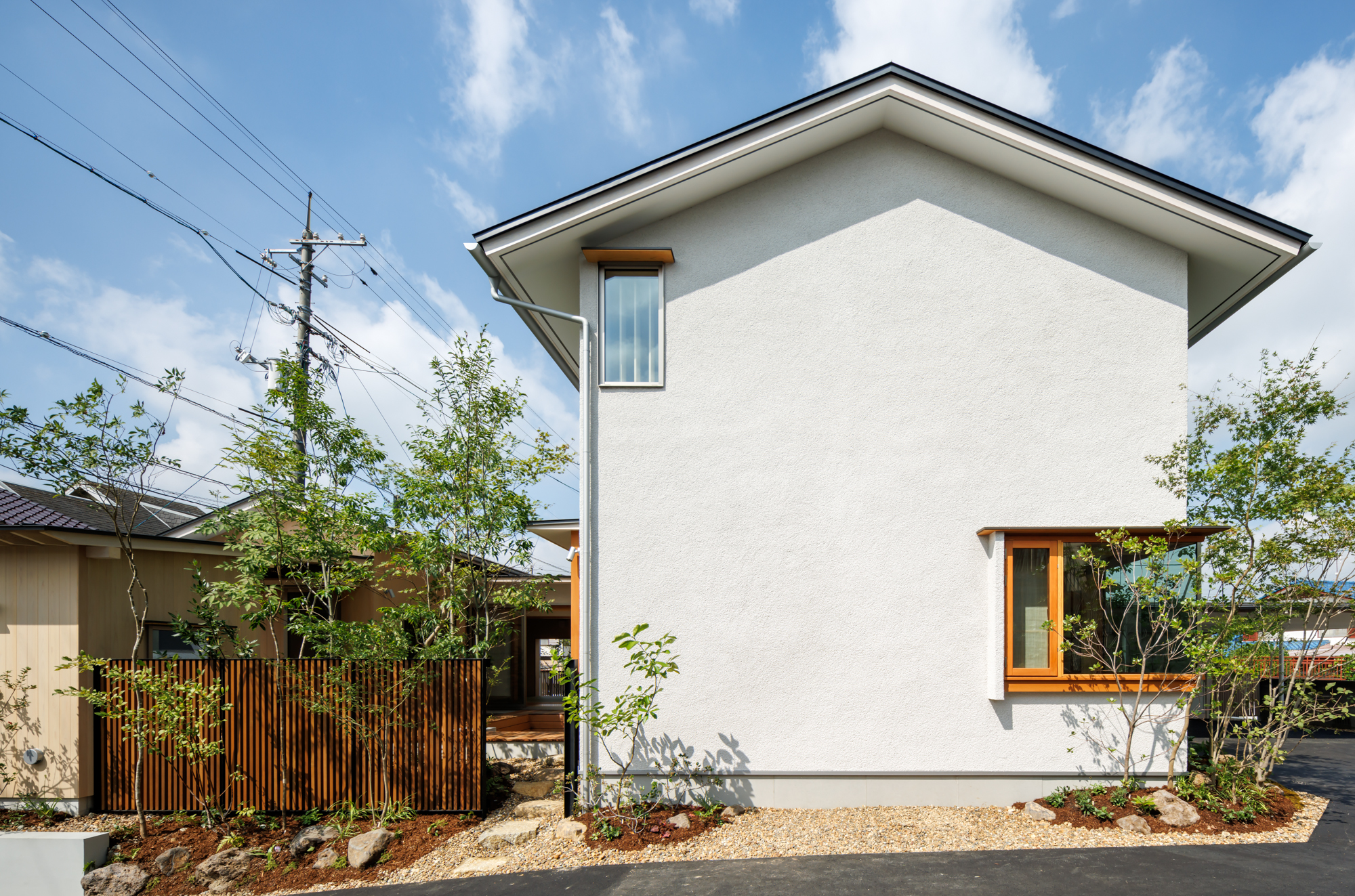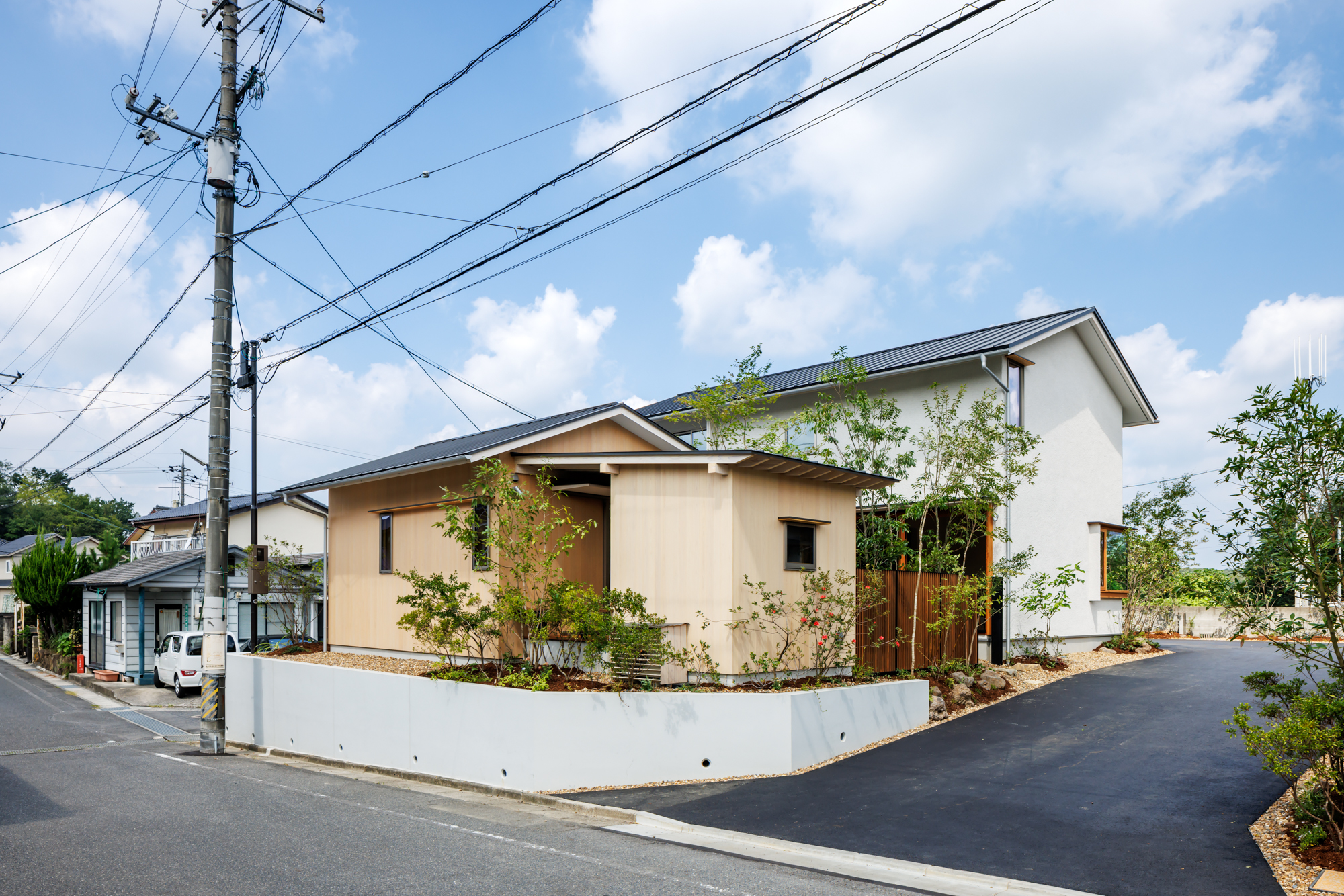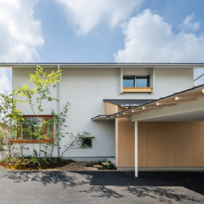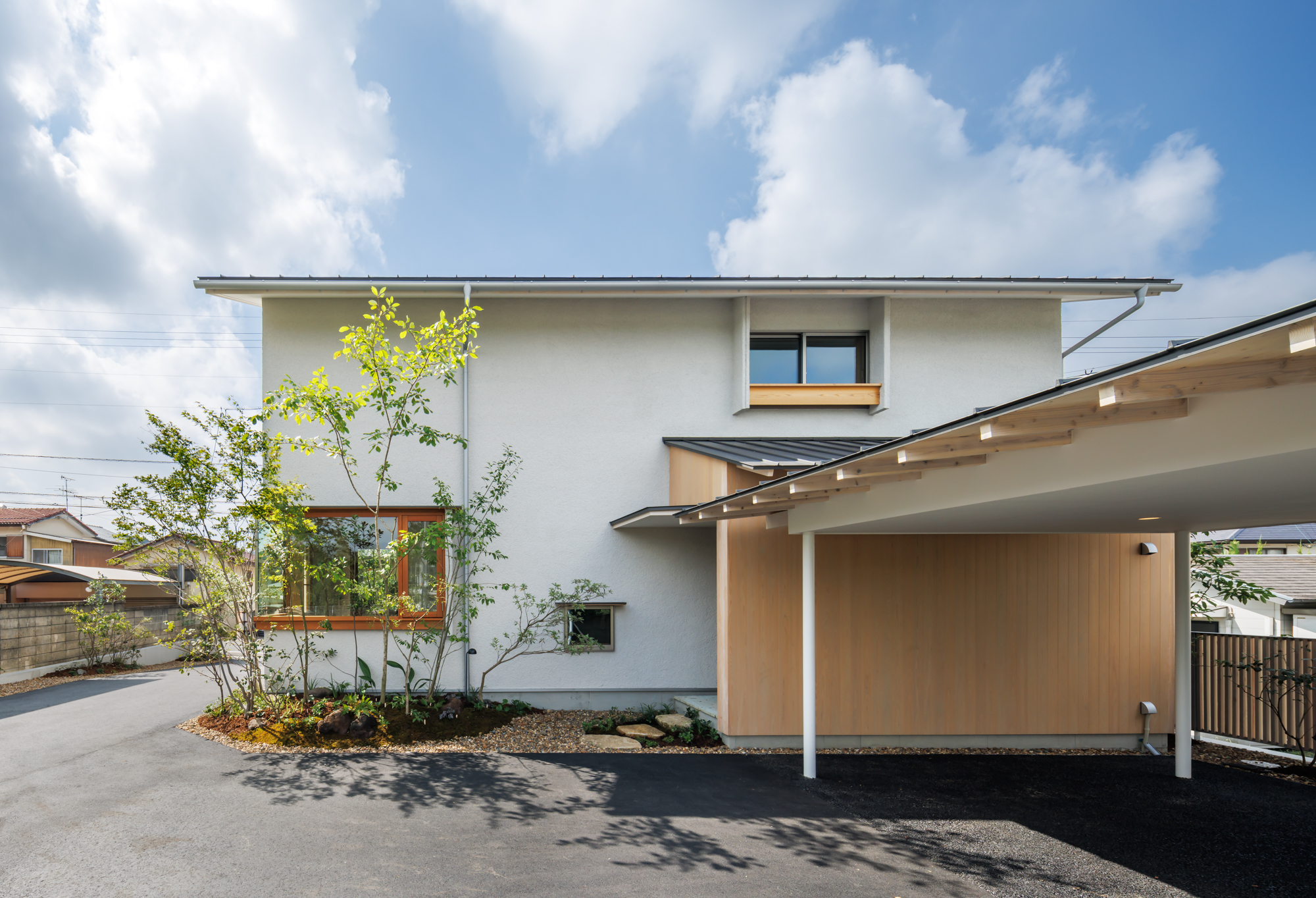 駐車スペースを、あえて敷地の奥側にすることにより、奥行きの感じられる佇まいとなっている。