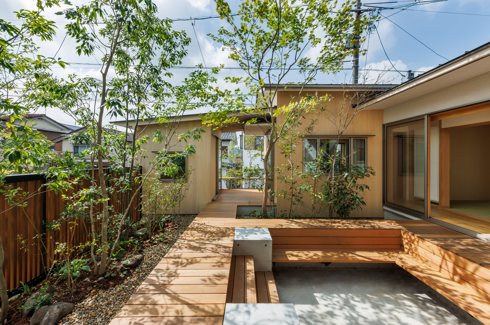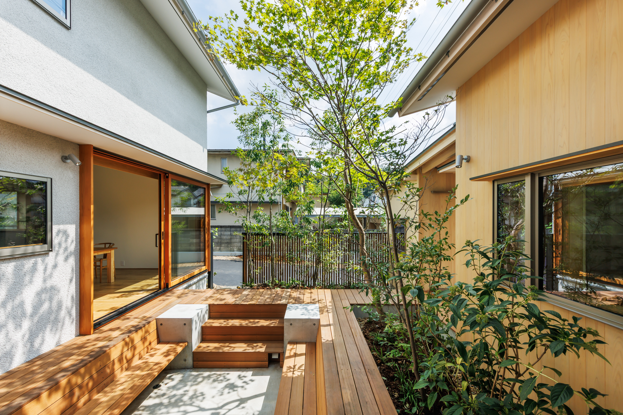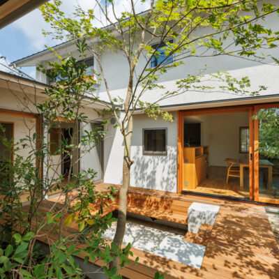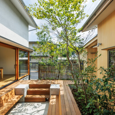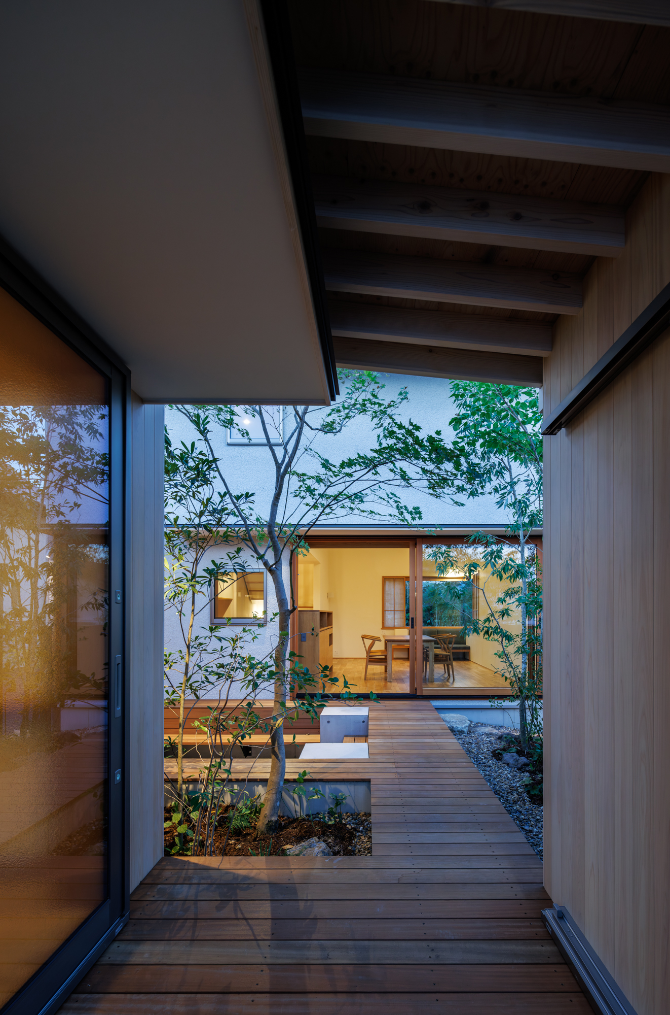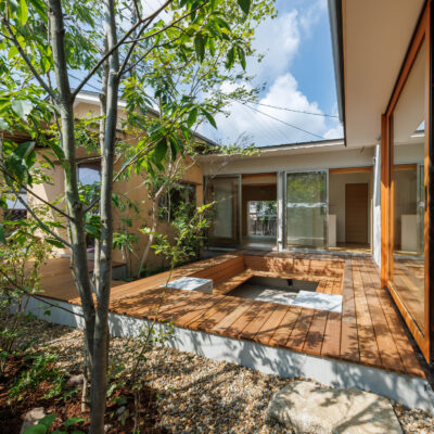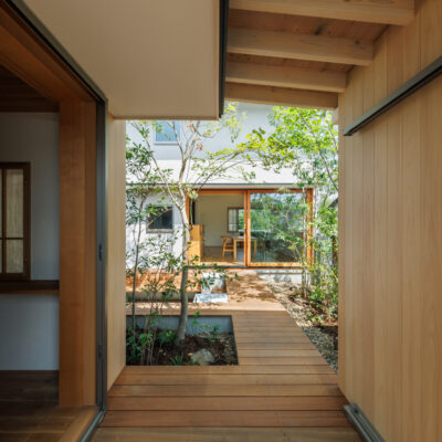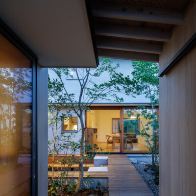 中庭は、単に光や風を取り入れるための庭ではなく、主室と一体となった生活の場として計画しています。室内と屋外を行き来する中で、植栽や光、風の気配が自然と感じられ、家族が互いの存在を意識しすぎることなく、緩やかにつながる距離が生まれます。
