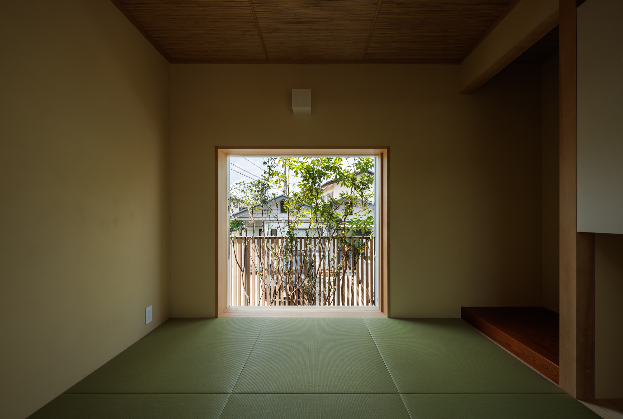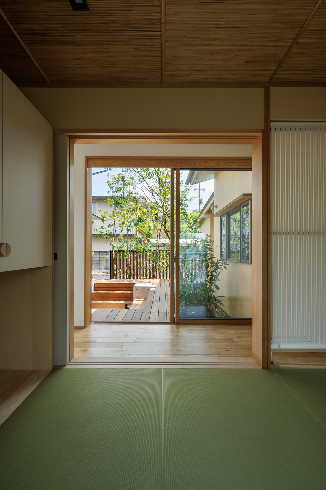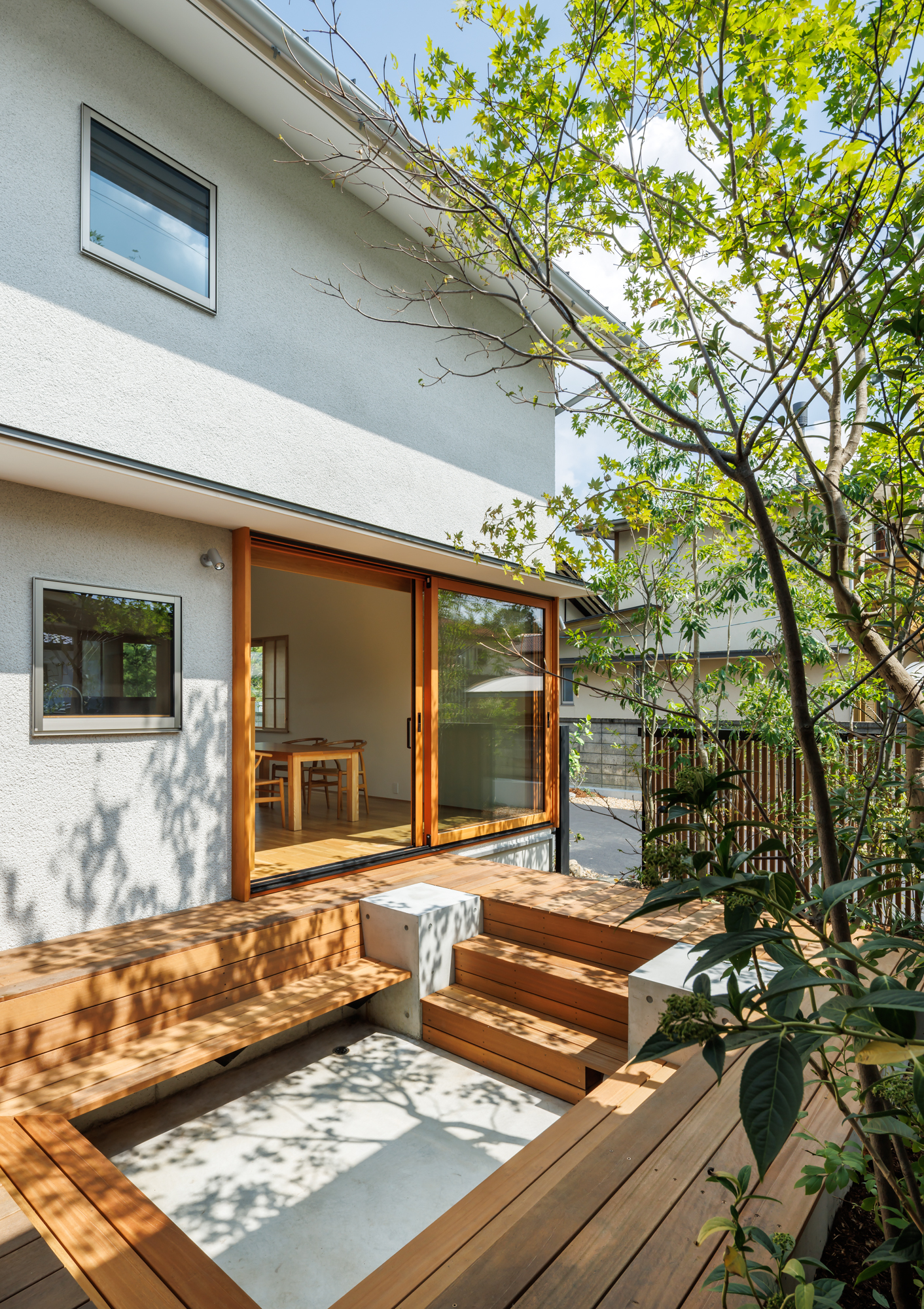 中庭は、単に光や風を取り入れるための庭ではなく、主室と一体となった生活の場として計画しています。室内と屋外を行き来する中で、植栽や光、風の気配が自然と感じられ、家族が互いの存在を意識しすぎることなく、緩やかにつながる距離が生まれます。