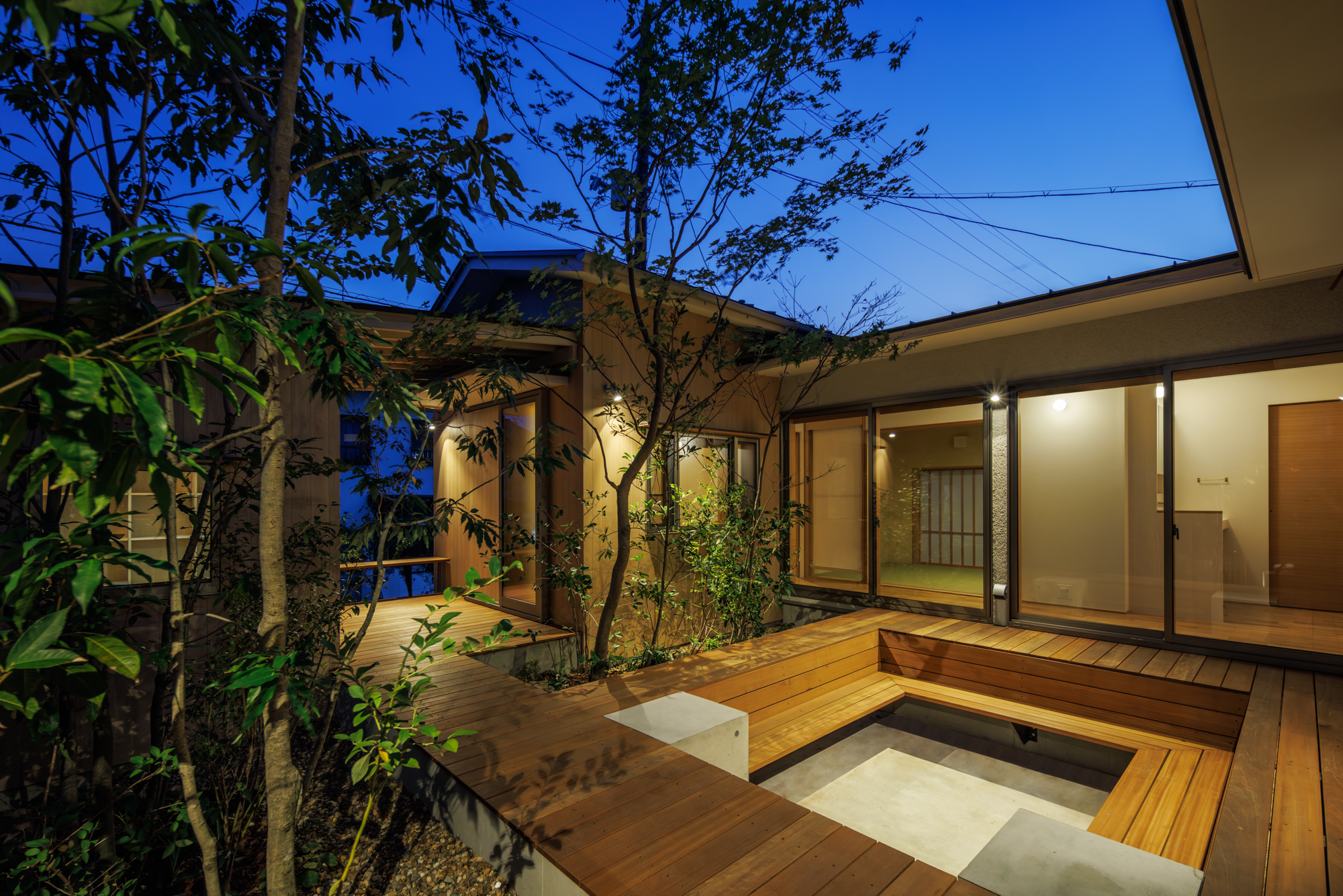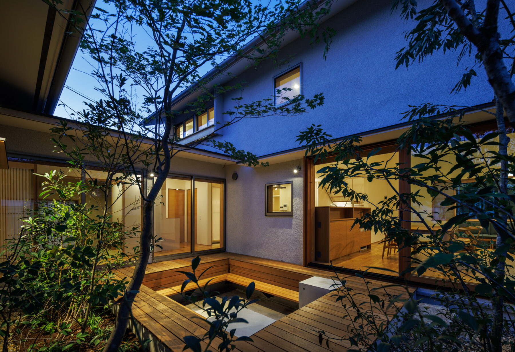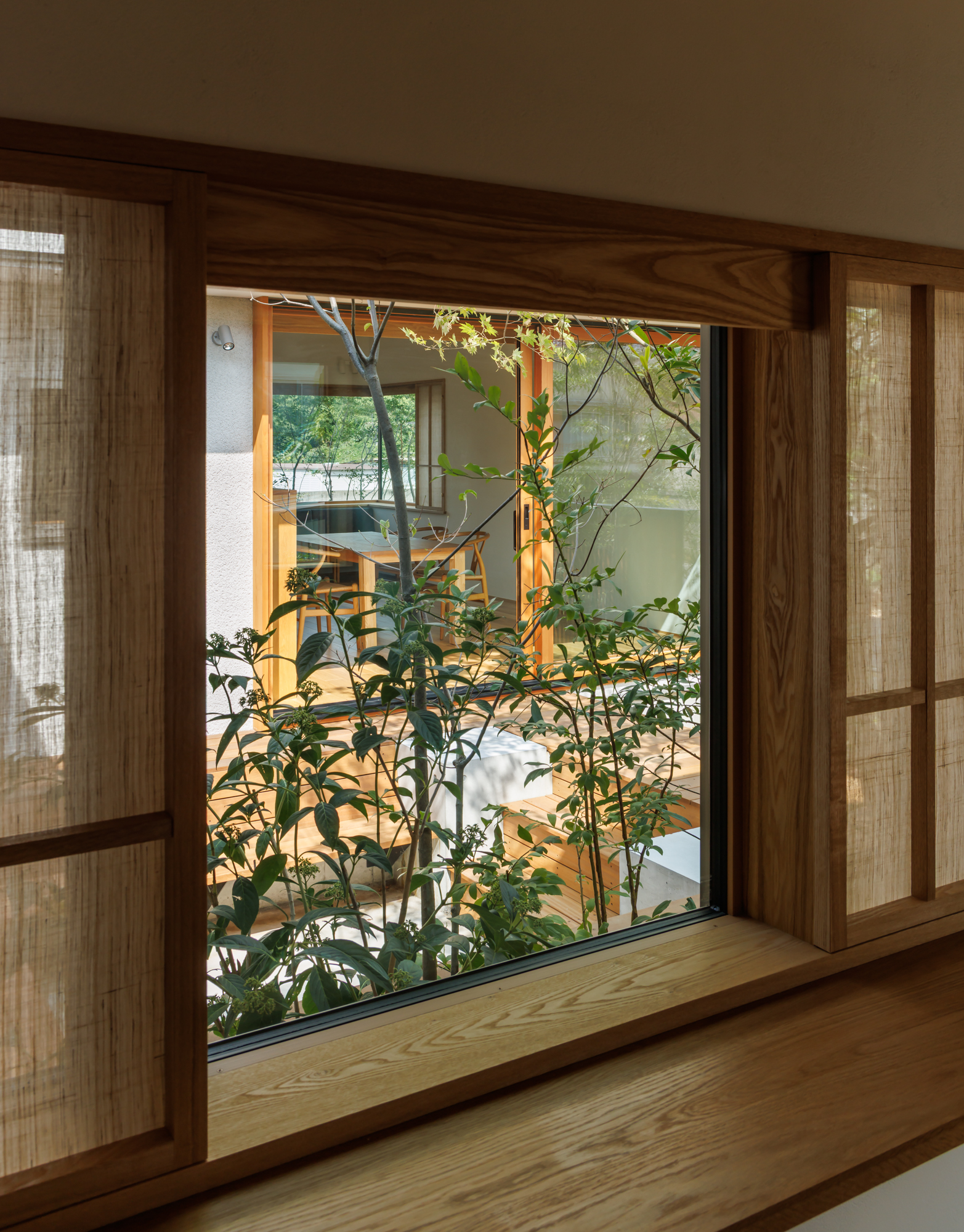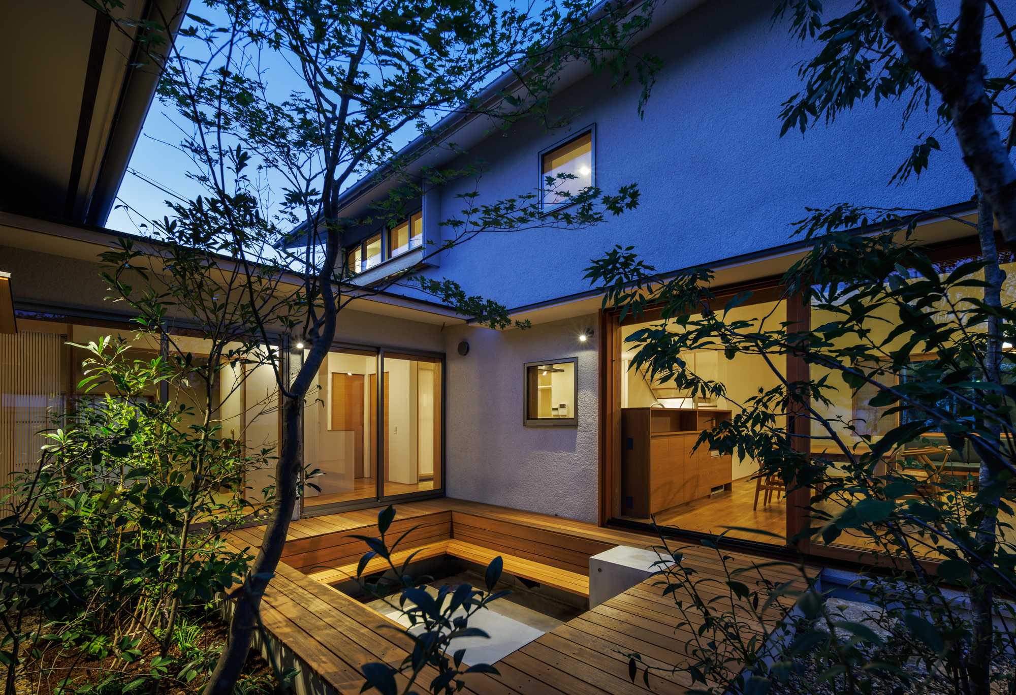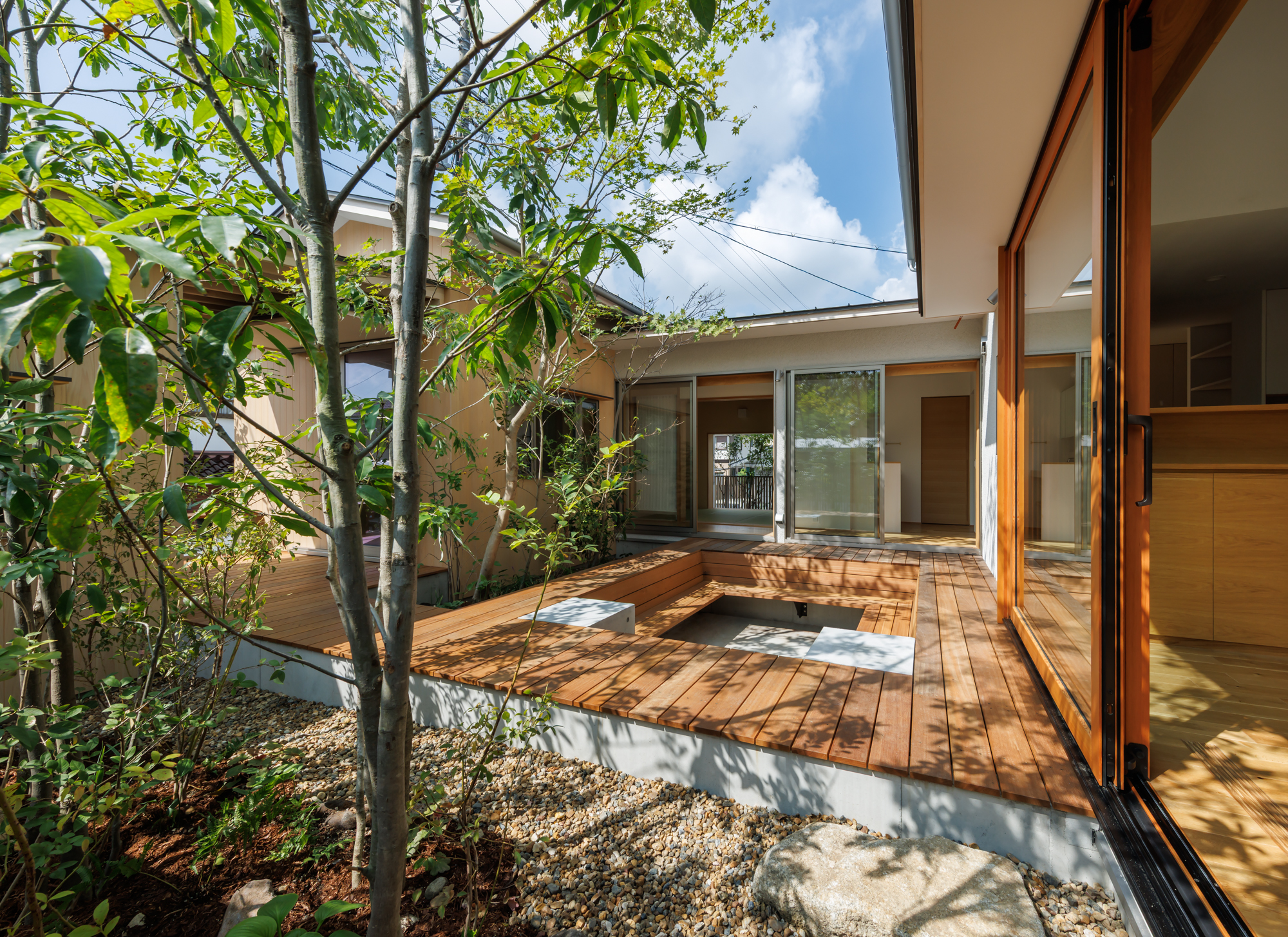 中庭は、ピットリビングとして少し沈んだ形式で、地盤面と植栽との距離を近くに感じられるようにしている。