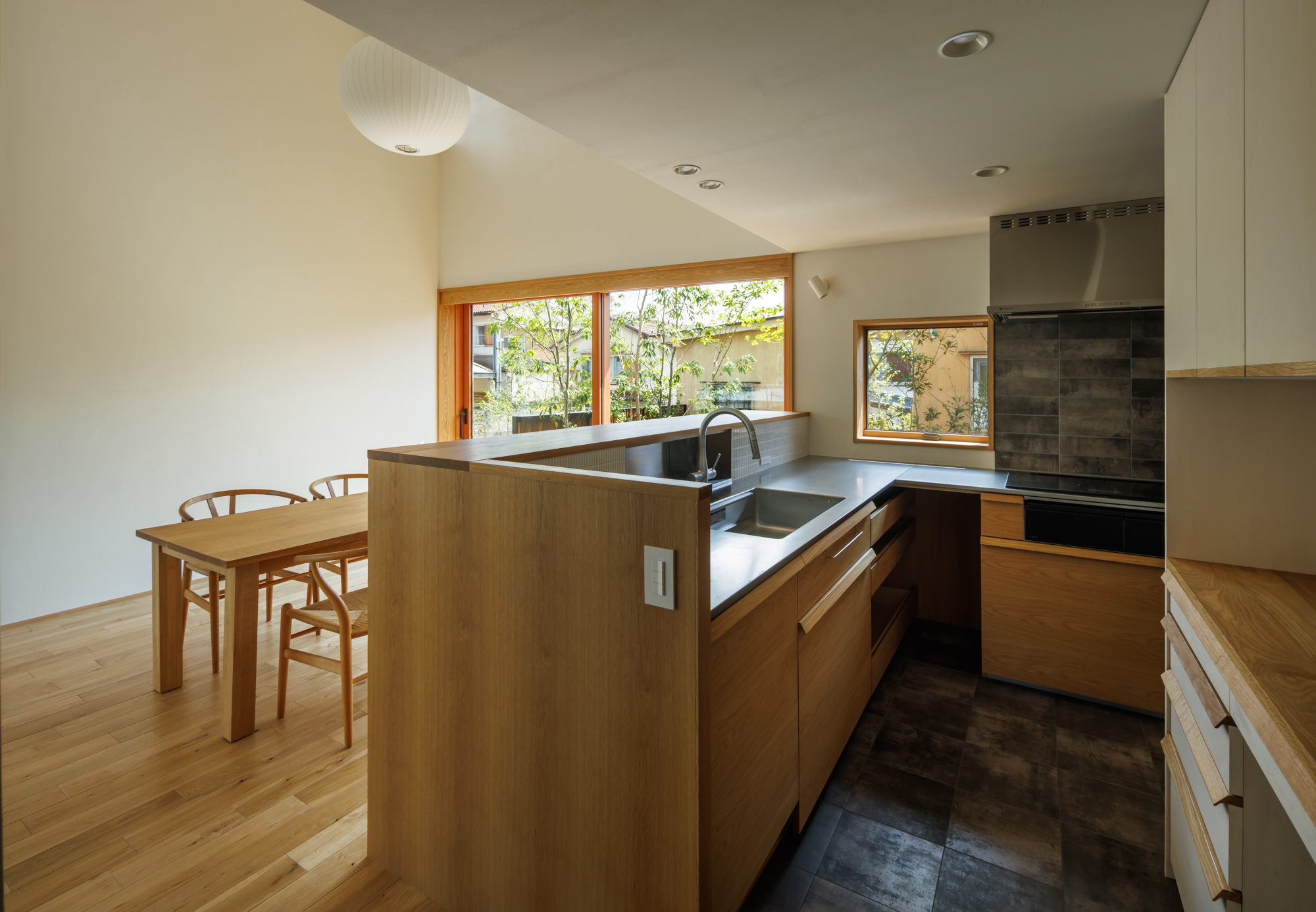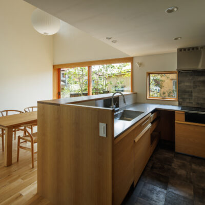キッチンはL型として、主室にも開きながら回遊できる動線をつくり出している。