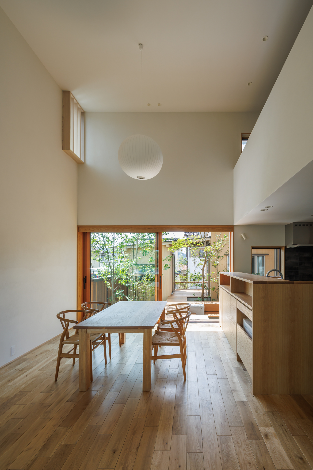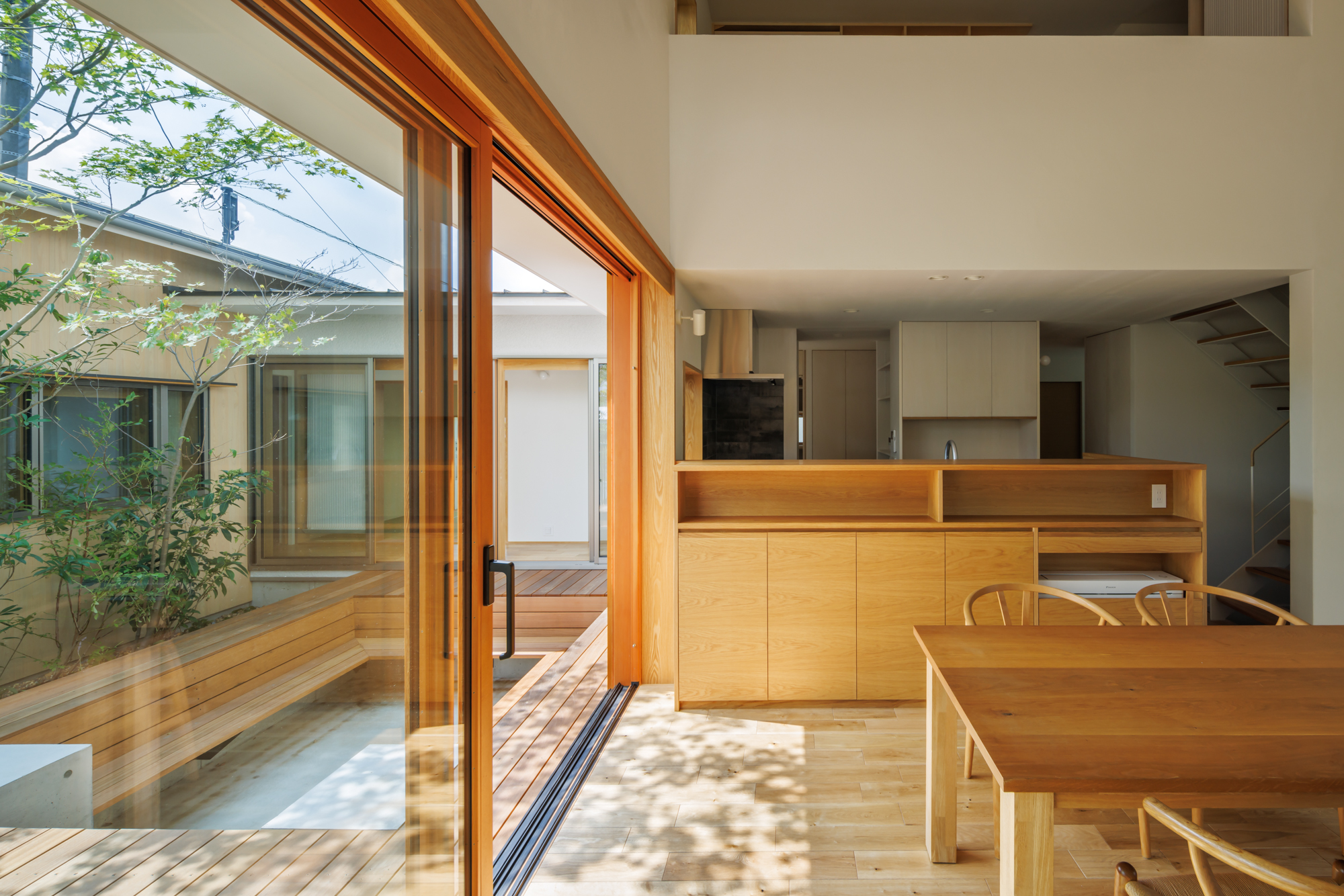 ダイニングからは、中庭とつながるデッキが一体となった空間としている。
