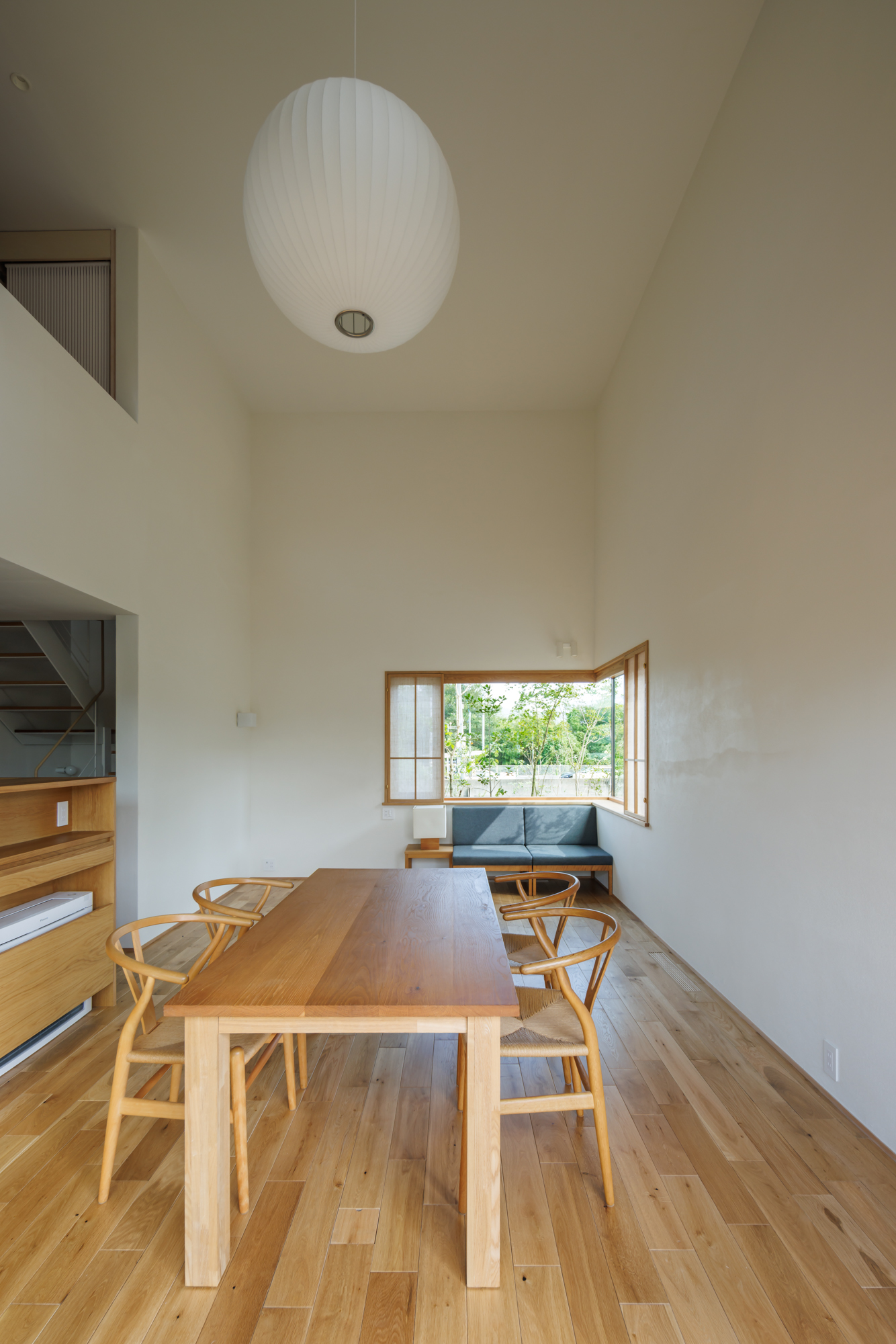 主室(リビング・ダイニング)は2層分の吹き抜けを持ち、2階のスタディコーナーと繋がり気配の感じる空間としている。