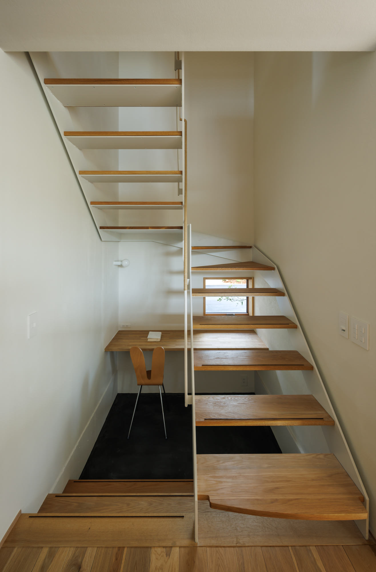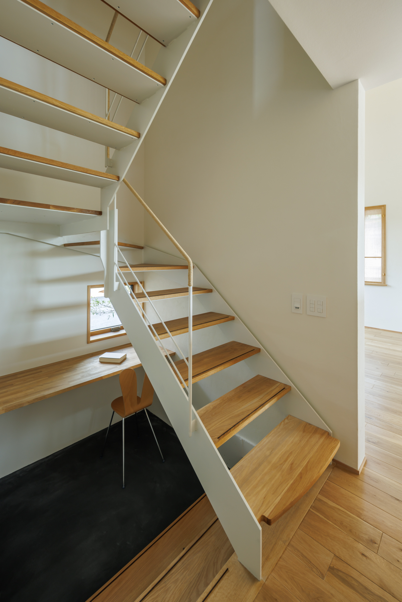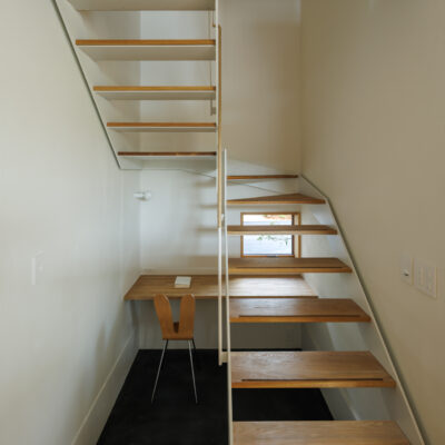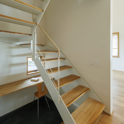 2階へ上がる階段は、鉄骨造とし階段下を書斎としてスペースを確保した。