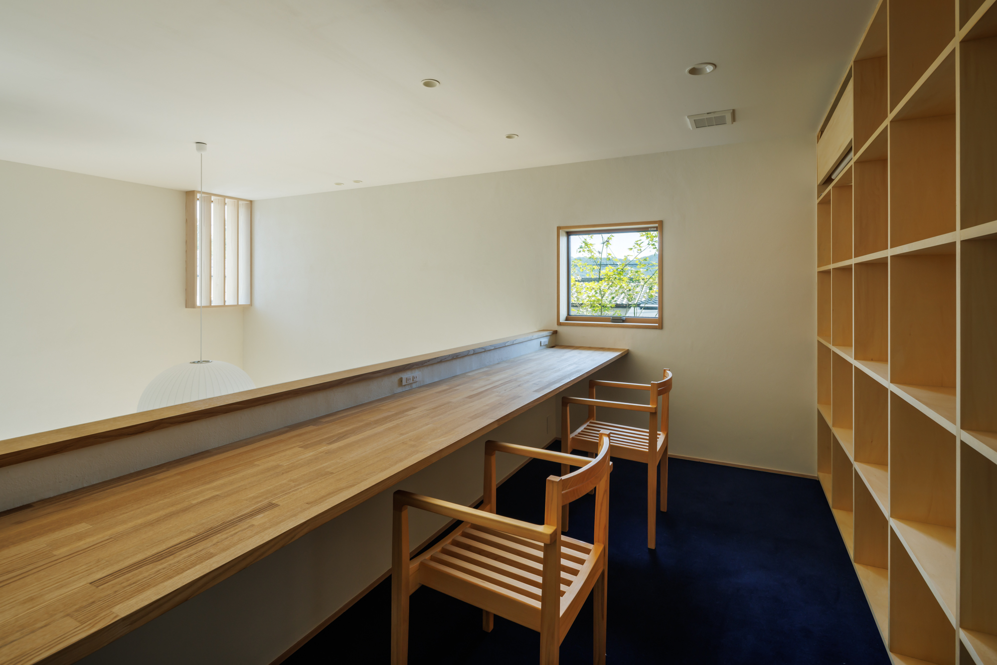 2階のスタディコーナー 吹き抜けと繋がった空間で、カウンターの反対側には本棚を設ている。