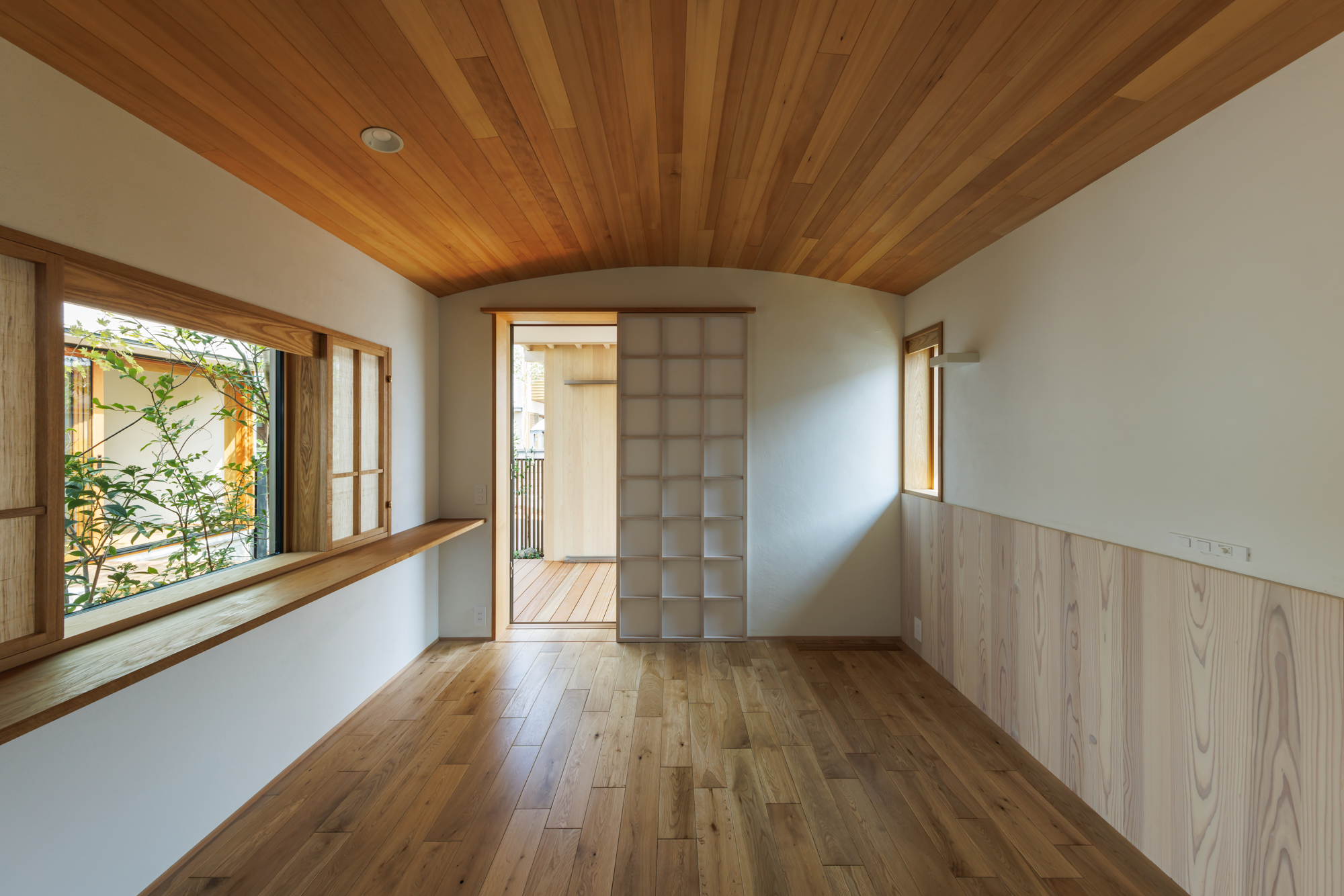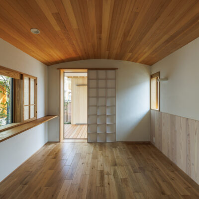主寝室は、平家建て部分に位置し天井を柔らかな木のR天井で空間を包んだ。