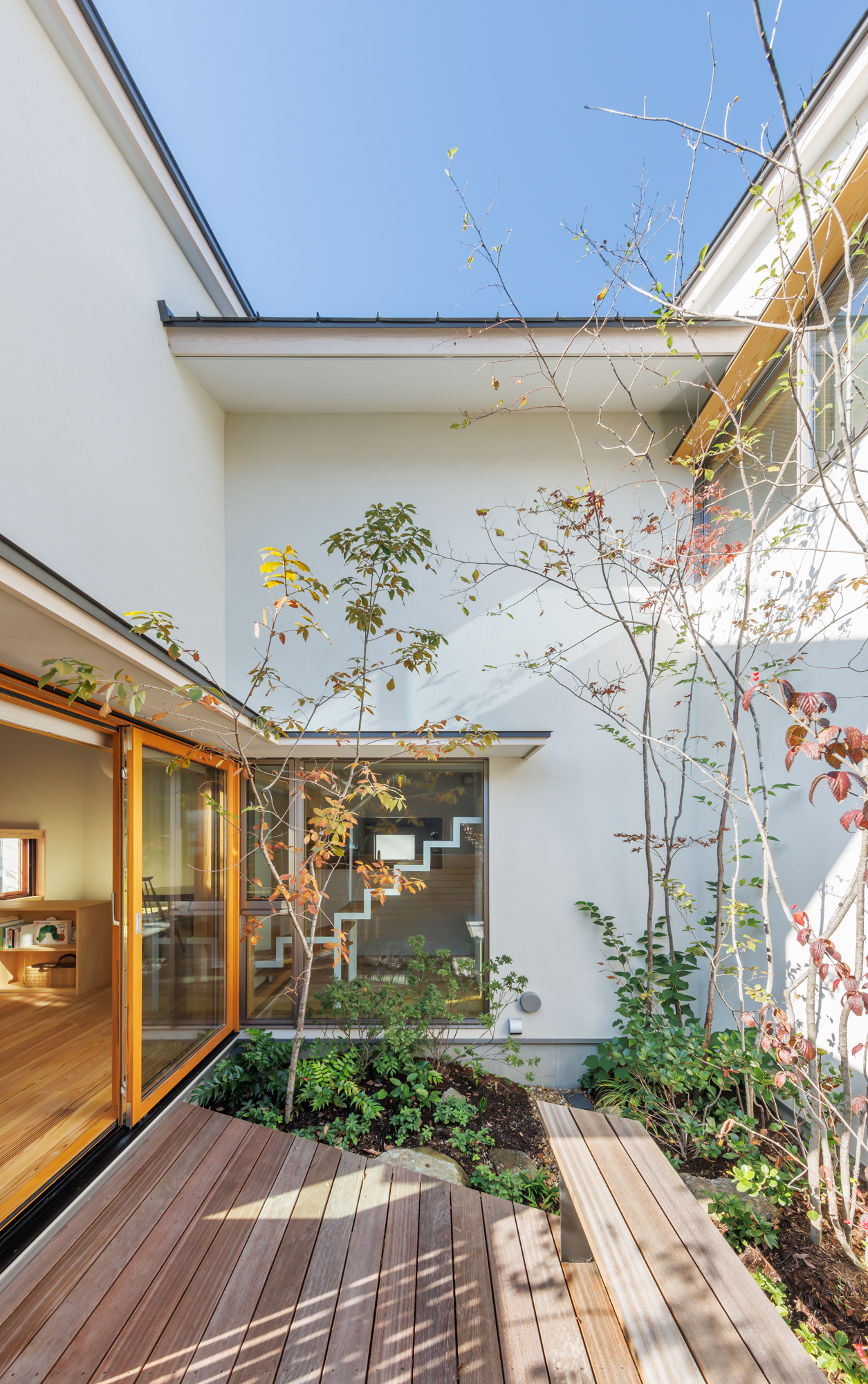 まず、南北の道路をつなぐように敷地内に路地状のアプローチを設け、両方の道路から出入りできる計画とした。その路地の途中に中庭を設け、緑を感じながら住まいへと向かう、小さな外部空間の連なりをつくっている。