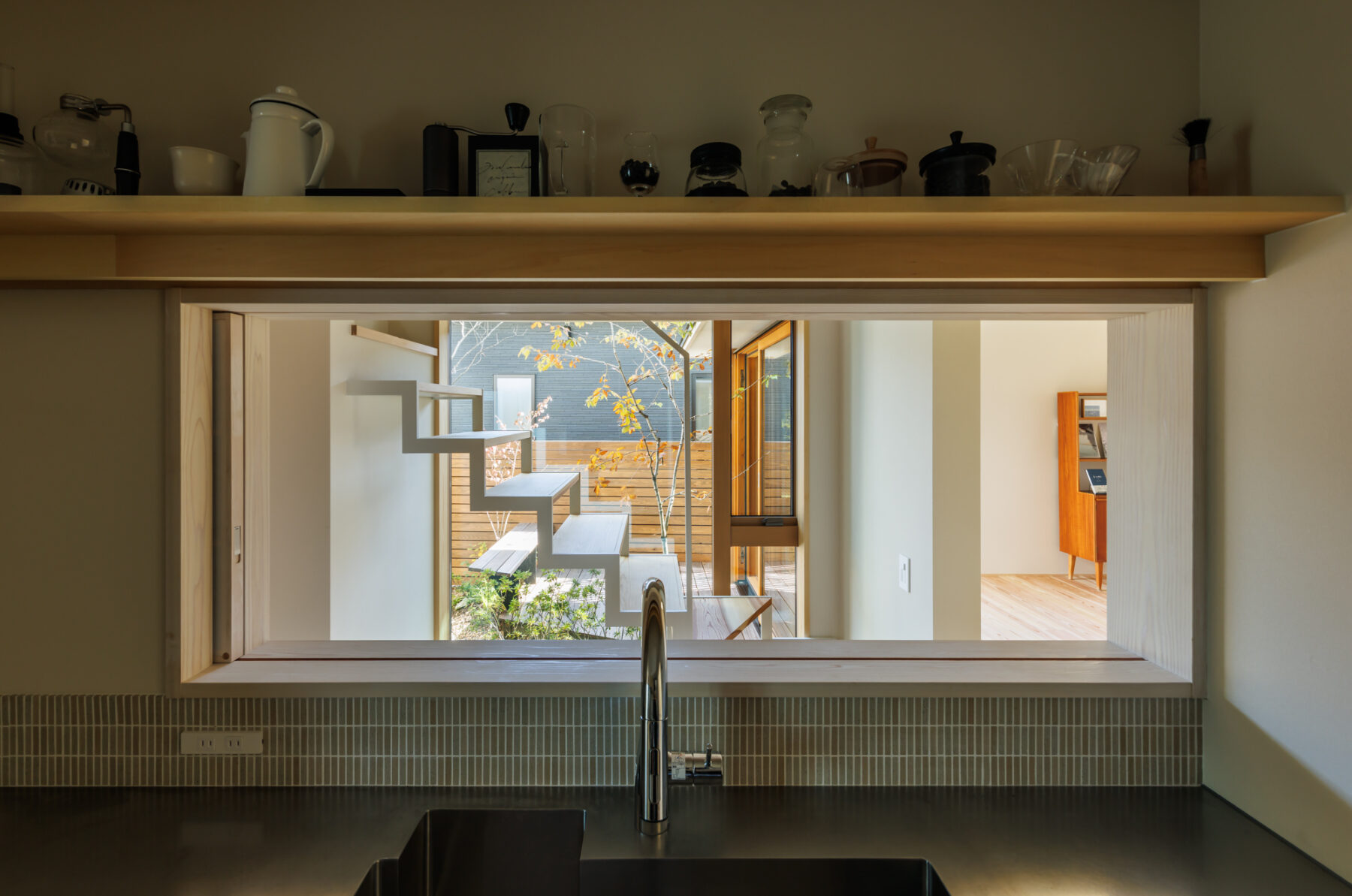 中庭を望めるキッチンと階段。階段は軽やかになるよう鉄骨にて設計を行なった。階段した部分には、猫の居場所のスペースとなる。キッチンには、障子を建て込んであり来客がある際には閉めて、雑多な雰囲気を隠せるようにしている。
