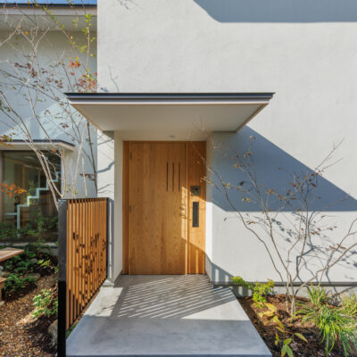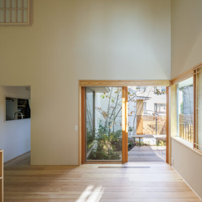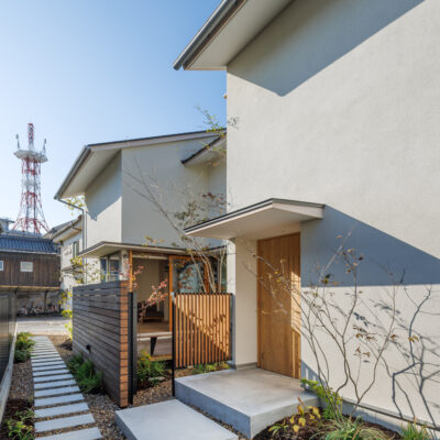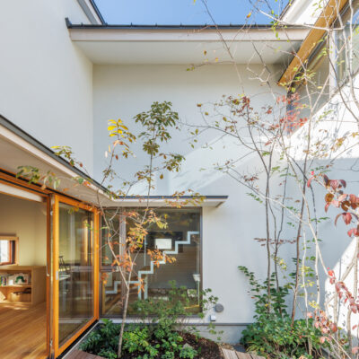 まず、南北の道路をつなぐように敷地内に路地状のアプローチを設け、両方の道路から出入りできる計画とした。その路地の途中に中庭を設け、緑を感じながら住まいへと向かう、小さな外部空間の連なりをつくっている。