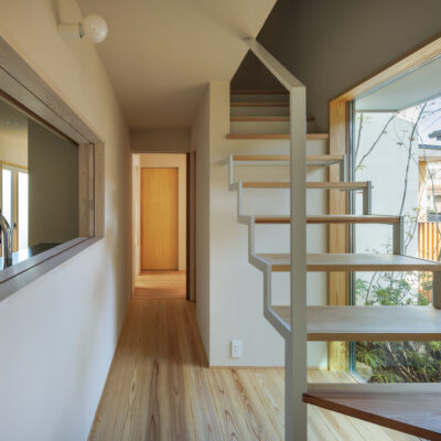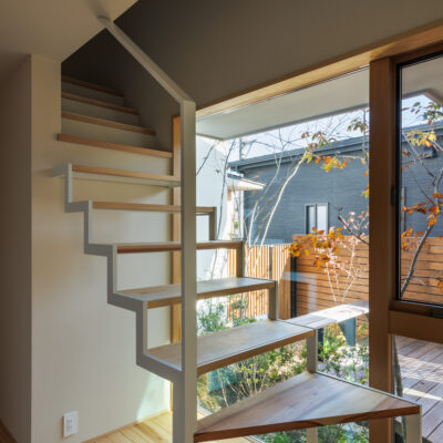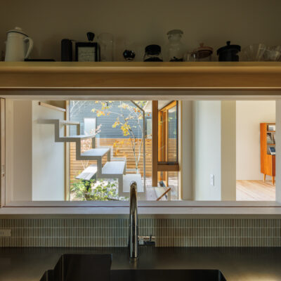 中庭を望めるキッチンと階段。階段は軽やかになるよう鉄骨にて設計を行なった。階段した部分には、猫の居場所のスペースとなる。キッチンには、障子を建て込んであり来客がある際には閉めて、雑多な雰囲気を隠せるようにしている。