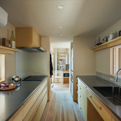 主室であるリビング・ダイニングは大きな吹抜けを介して2階とつながり、上下階が緩やかに連続する空間としている。キッチンは猫との暮らしにも配慮し、独立性の高い空間としながら、キッチン・パントリー・洗面へと連続する家事動線をまとめ、コンパクトながら回遊性のある構成とした。